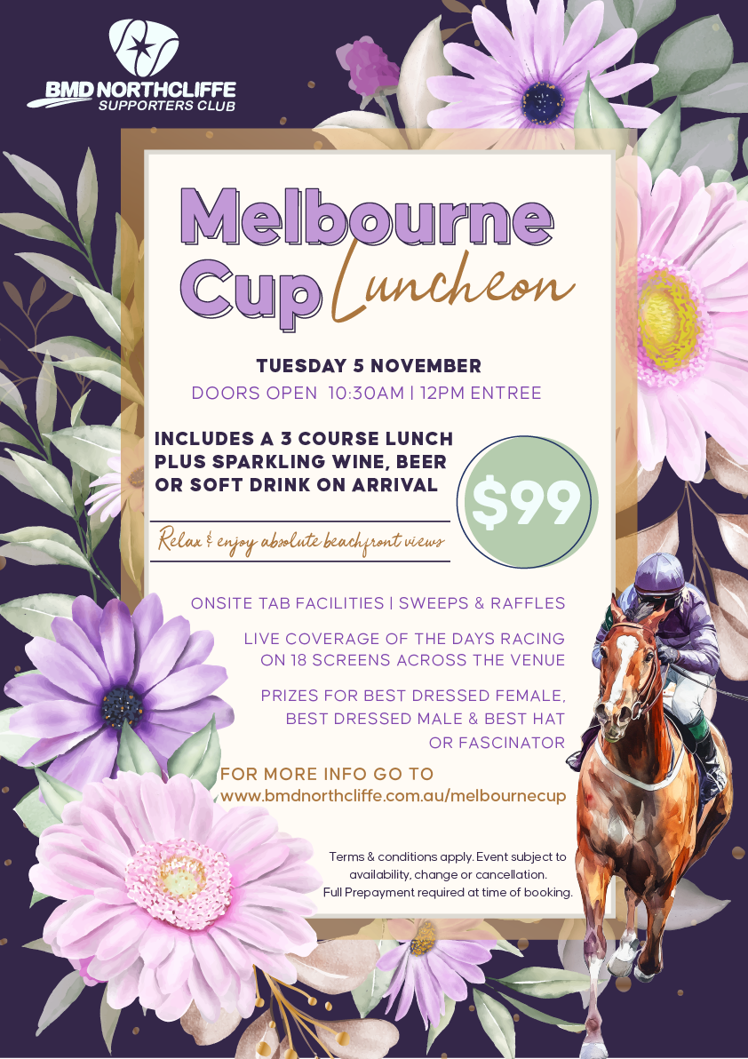 It's time to Giddy Up for the Melbourne Cup! Secure your spot this Melbourne Cup at BMD Northcliffe Surf Club. Enjoy a decadent 3 course lunch plus sparkling wine, beer or soft drink on arrival along with our beautiful beachfront views! We have onsite TAB facilities plus live coverage of the days racing on 18 screens throughout the venue. Best dressed, best fascinator/hats, lucky door prizes, sweeps and raffles will all be part of thrills and frills at BMD Northcliffe Surf Club! Please note that bookings of 6 or less people may be combined with other bookings.